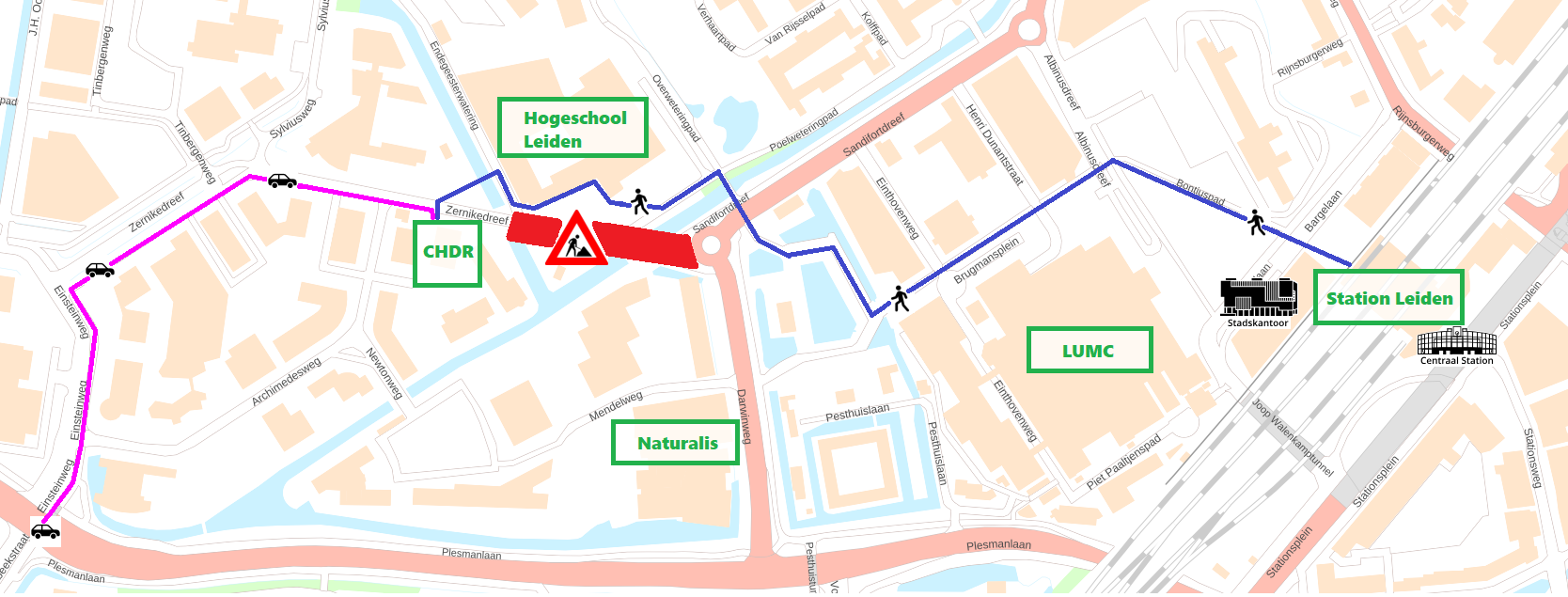 Lopend: u kunt ons onderzoekscentrum bereiken door vanaf het station naar Hogeschool Leiden te lopen. Bij de hoofdingang van de hogeschool slaat u linksaf en loopt u langs het gebouw richting de Zernikedreef. Naast de hogeschool is een tijdelijke brug aangelegd, deze steekt u over. Vervolgens kunt u het onderzoekscentrum aan de overkant van de straat zien liggen.