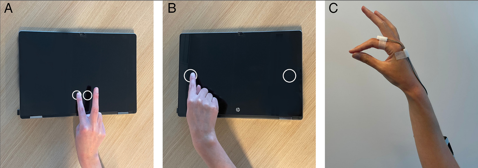 Bij de test A moesten deelnemers afwisselend met hun wijs- en middelvinger op een scherm tikken, binnen de aangegeven kleine cirkels. Bij test B moesten deelnemers met hun wijsvinger om en om twee cirkels aantikken die 20 cm van elkaar op het scherm geplaatst waren. Bij deze tests werd er via het scherm gemeten hoe snel deelnemers de test uitvoerden. In test C moesten deelnemers zo snel mogelijk hun duim en wijsvinger tegen elkaar tikken, en daarbij de vingers ook steeds zo wijd mogelijk openen. Door middel van sensoren op de vingers konden de bewegingen worden gemeten.